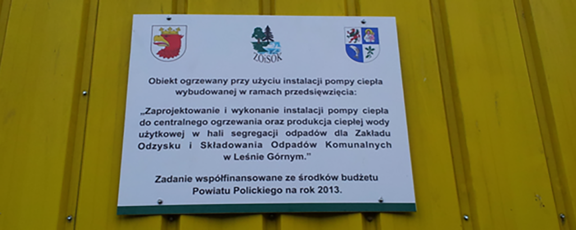Z końcem sierpnia br. zakończono realizację zadania pn.: “Zaprojektowanie i wykonanie instalacji pompy ciepła do centralnego ogrzewania oraz produkcja ciepłej wody użytkowej w hali segregacji odpadów dla Zakładu Odzysku i Składowania Odpadów Komunalnych w Leśnie Górnym”. Zgodnie z umową zawartą pomiędzy Gminą Police a Starostwem Polickim projekt współfinansowany jest ze środków budżetu Powiatu Polickiego na rok 2013.